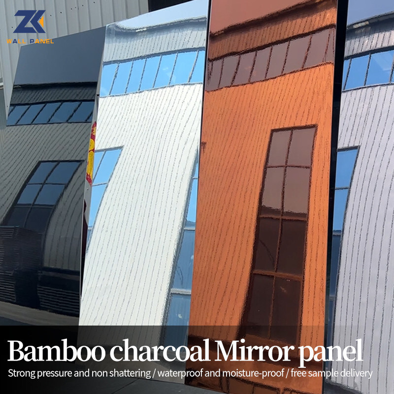 Mirrored PET bamboo charcoal wood panel, the appearance texture is exactly the same as the mirror surface, it is a decorative wood veneer panel that is waterproof, moisture-proof, wear-resistant and scratch-resistant, and easy to bend. Combining the alluring charm of a mirror with the natural benefits of bamboo charcoal, mirrored bamboo charcoal panels elevate your living space to new heights, harmonizing beauty and function like never before. Unleash the visual appeal and enjoy an attractive reflective surface that expands your living space. Our mirrored bamboo charcoal panels easily capture and play with light, creating an illusion of openness and grandeur. Transform your room into a shrine of elegance and sophistication. Mirrored bamboo charcoal wall panels not only purify the air by absorbing unwanted odors and pollutants, but also create a peaceful atmosphere that promotes relaxation and well-being. Embrace the tranquility that only the natural elements can provide.