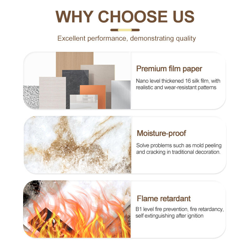 Easy Installation,Environmental Protection,Flexible,Bendable,High Density, foldable.Fireproof +waterproof+Moisture-proof+anti-scratch+Sound-Absorbing, Mould-Proof.Lightweight.Clear textures,Variety of colours,etc.