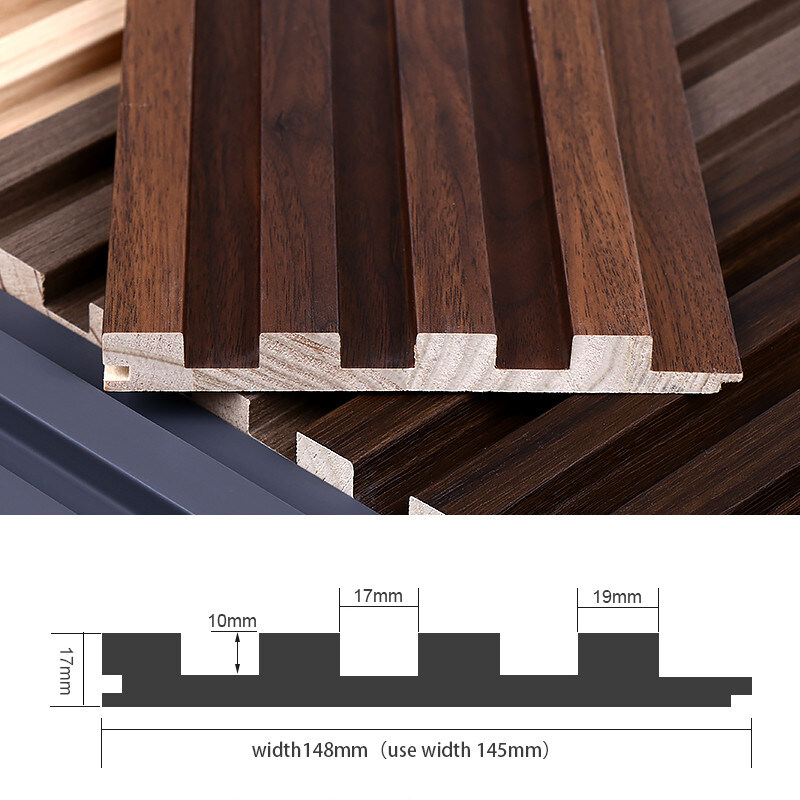 Environmentally Friendly Wall Panels Wood Grille Grooved Solid wood siding is an interior wall covering made of solid wood with a grille groove design consisting of channels or grooves in the surface of the solid wood to provide a decorative and visually appealing effect. The panels are made of solid wood, a natural renewable resource. A focus on environmental protection means the wood used in these panels comes from sustainable forests or managed plantations, helping to minimize environmental impact. The manufacturing process of these panels is designed to have minimal environmental impact. This may include using environmentally friendly adhesives and finishes that do not contain harmful chemicals or volatile organic compounds (VOCs). The fluted surface of the wall panels adds a stylish and decorative element to interior spaces. Designs can vary, offering options for different aesthetic preferences and interior design themes.