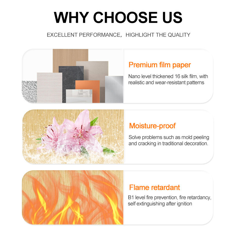 Easy Installation,Environmental Protection,Flexible,Bendable,High Density, foldable.Fireproof +waterproof+Moisture-proof+anti-scratch+Sound-Absorbing, Mould-Proof.Lightweight.Clear textures,Variety of colours,etc.